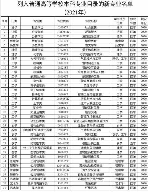 教育部最新通知:普通高校本科专业目录新增37个新专业